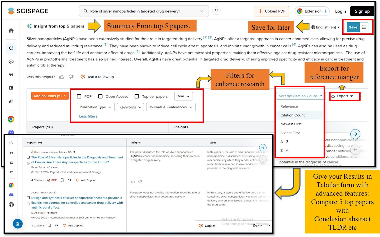 SciSpace goes beyond being a traditional search engine. It provides an overall summary of the top five papers related to your query with references from where the summary was derived, providing credibility to the information shared.