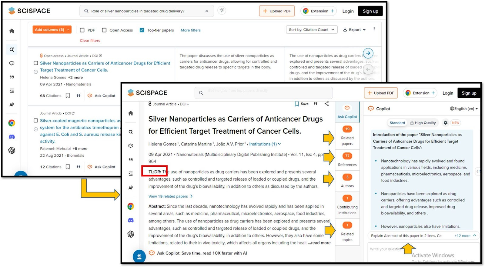 SciSpace presents paper-specific summaries through columns for all the papers in the search results including: