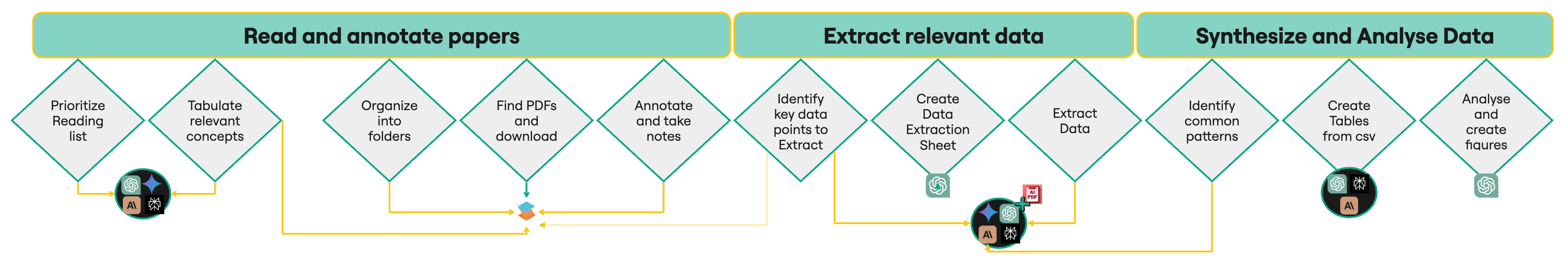 Traditional Approach: Reading and synthesizing information involves manually reading through papers, taking notes, and summarizing findings.AI-Enhanced Workflow: