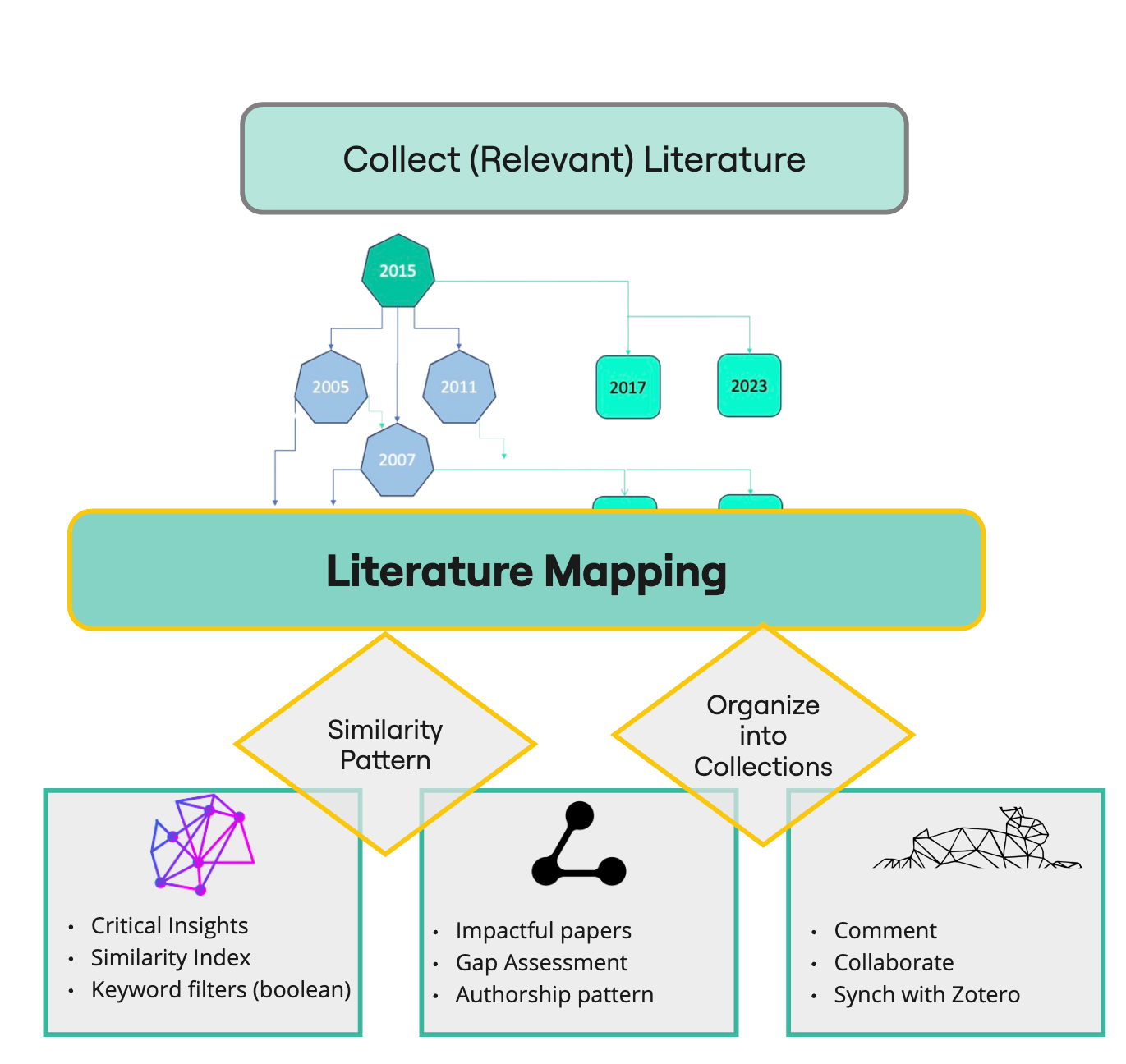 Traditional Approach: Literature mapping traditionally involves manually organizing and categorizing papers, often using spreadsheets or index cards.AI-Enhanced Workflow: