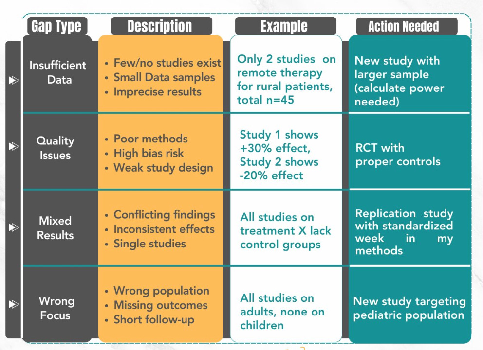 That changed when I discovered a framework from this paper. These researchers developed a method to help systematic review authors explicitly identify and present research gaps. But when I read it, I thought, why limit this to SRs? So, I’ve adapted this framework for everyday use because the logic is universal.