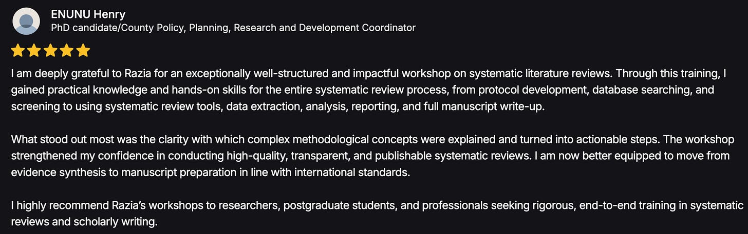 My Systematic Review workshop has been converted into a comprehensive course! The promo period has ended, but if you have a genuine need for a discount, just reach out and we’ll work something out.